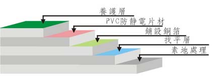 ⑤貼PVC防靜電片材:采用導電膠粘劑刷涂在PVC防靜電片材上,遵守晾置時間,進行加壓膠接,然后處理接縫處,用膠焊機把防靜電焊條接好,并處理;